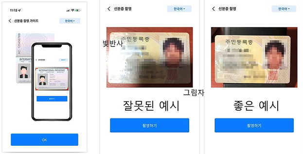 ※ 주의: 촬영한 신분증에 빛 반사와 그림자가 생기면 KYC 인증이 반려될 수 있습니다.