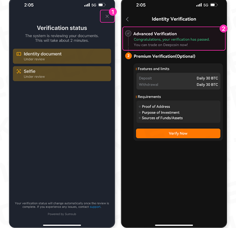 • ① KYC 심사는 보통 수 분 내로 완료됩니다.